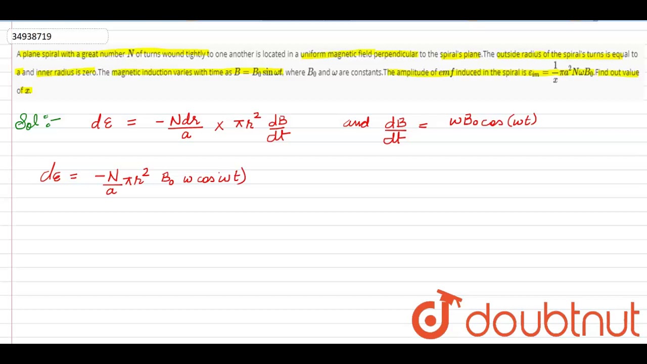 A plane spiral with a great number `N` of turns wound tightly to one another is located in a uniform magnetic field perpendicular to the spiral\'s plane.The outside radius of the spiral\'s turns is equal to a and inner radius is zero.The magnetic induction varies with time as `B=B_(0) sin omega t`, where `B_(0)` and `omega` are constants.The amplitude of `emf` induced in the spiral is `epsilon_(im)=1/xpia^(2) NomegaB_(0)`.Find out value of `x`.